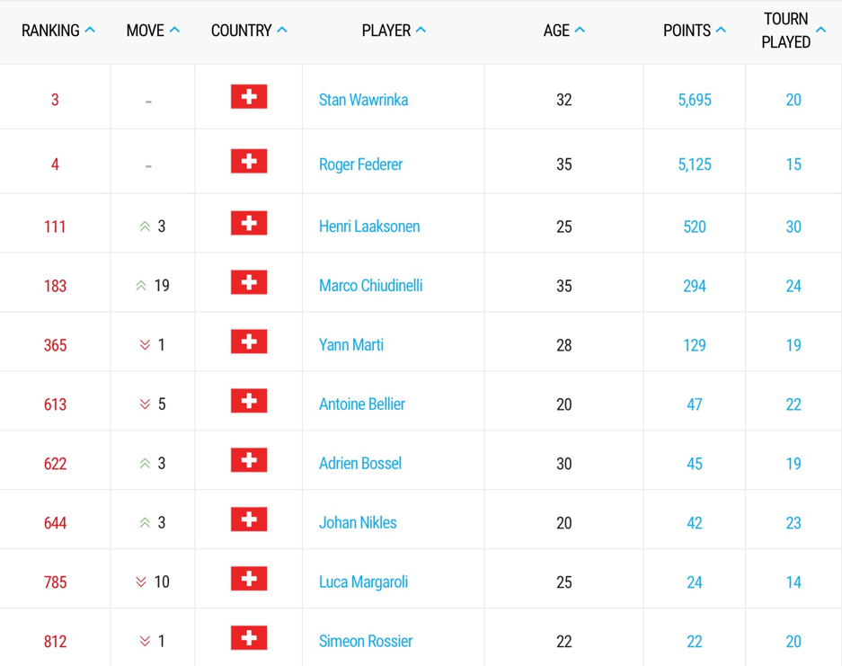 Pour mieux illustrer ce propos, voici la classification des joueurs suisses fin avril 2017 au classement ATP :