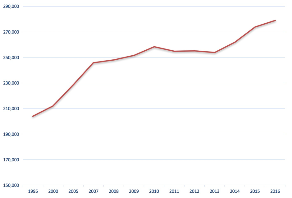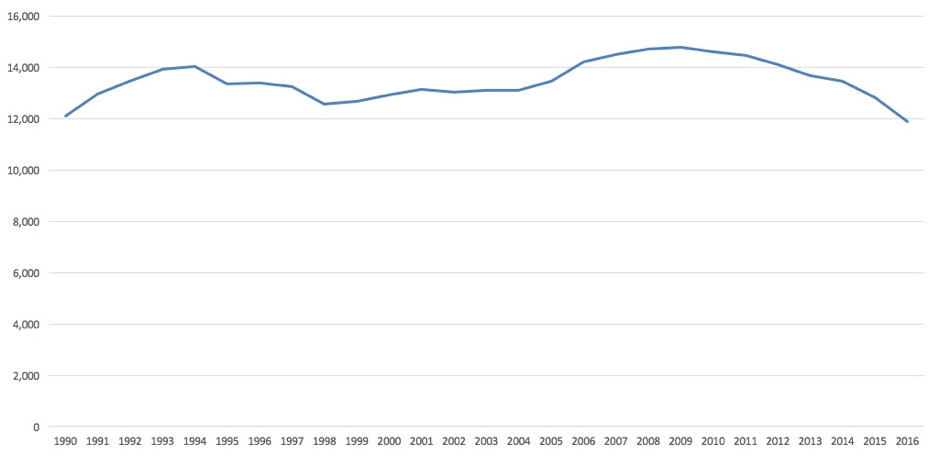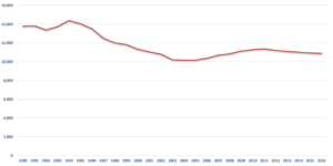 En résumer, sur une période de 20 ans, les juniors sont en baisse et les seniors en hausse et grosso modo, le nombre total de joueuses et joueurs de tennis est stable même s’il y a une baisse de 5% entre 2011 et 2016 :