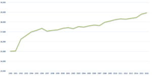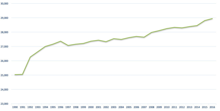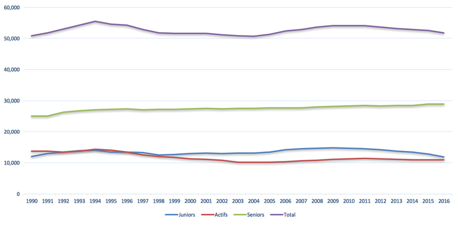 Une augmentation constante depuis les années 90 et qui culmine à près de 29’000 joueurs en 2016. En une vingtaine d’années, les seniors ont progressé de 7%. Bien entendu, cette courbe est intéressante si on voulait jouer un rôle important dans le trophée des légendes https://fr.wikipedia.org/wiki/Trophée_des_Légendes mais pas tellement pour assurer une relève à Roger ou Stan.