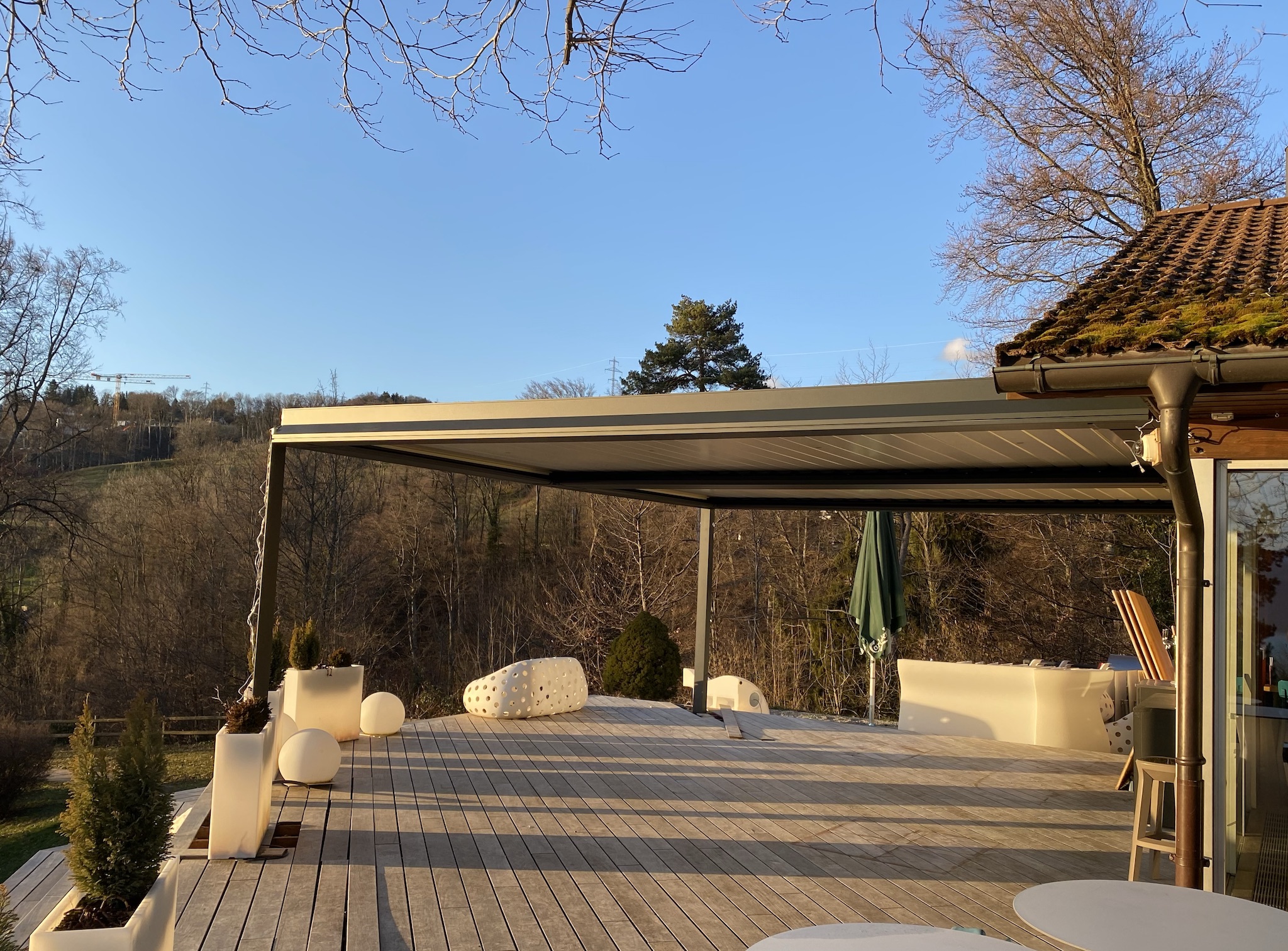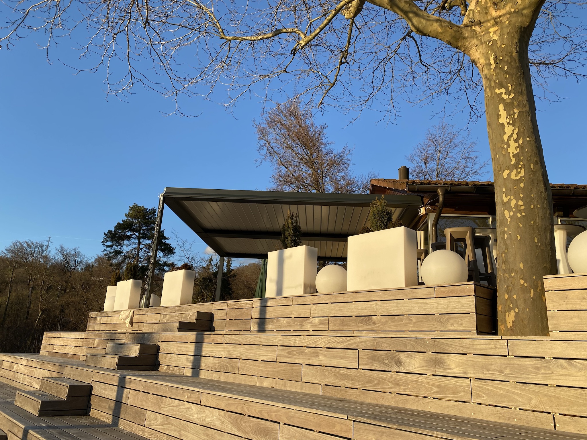 Depuis que la nouvelle terrasse est en place, la partie sud-ouest a toujours été exposée au soleil et dans le but d’atténuer l’exposition à notre étoile, le restaurateur a mis en place quelques parasols. Cette solution n’a jamais été satisfaisante et les frères Butturini ont décidé d’investir dans une véranda afin d’offrir un ombrage optimal durant les journées ensoleillées… y compris pour les jours pluvieux.