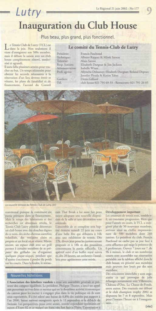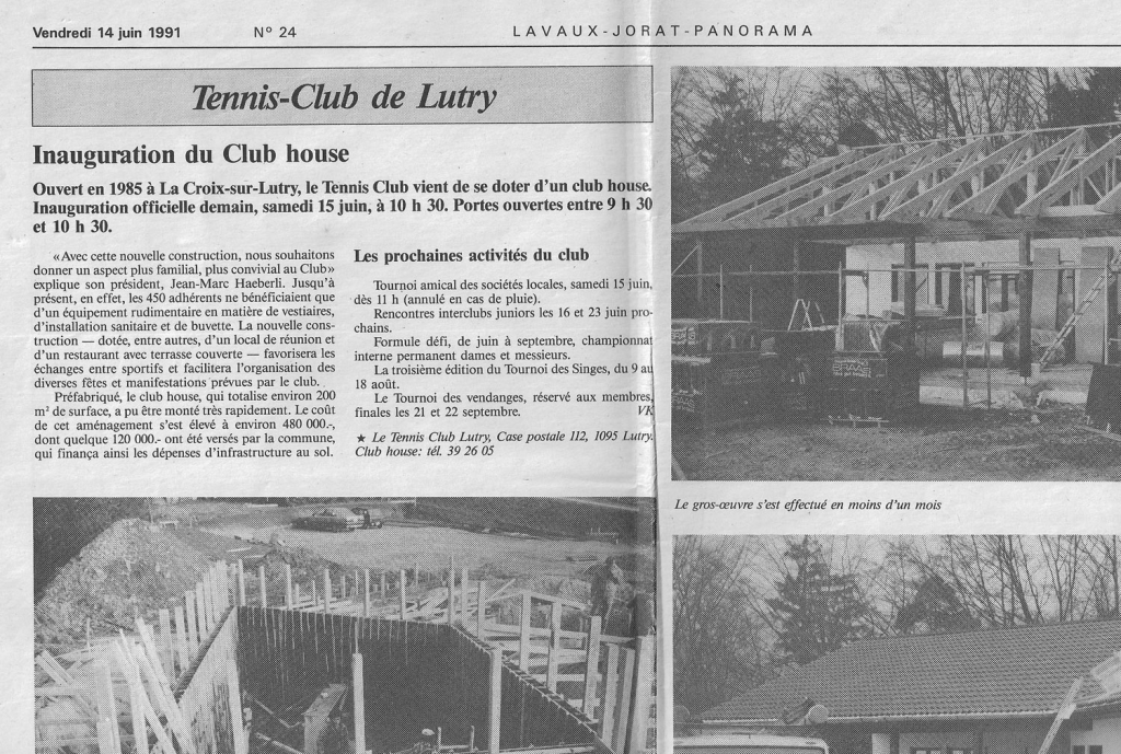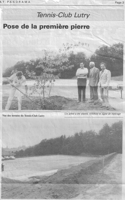 C’est justement à cette période qu’une belle aventure commence : après de longues démarches menées par MM. Dentan, Notari et Oswald, la première pierre du Tennis Club de Lutry est posée le 23 août 1984. Quelques mois plus tard, en avril 1985, le club ouvre ses portes. Niché au cœur du Lavaux, il offre une vue imprenable sur le lac et les Alpes — un cadre tout simplement exceptionnel. Le site fait d’ailleurs partie intégrante du plan d’affectation cantonal Lavaux.