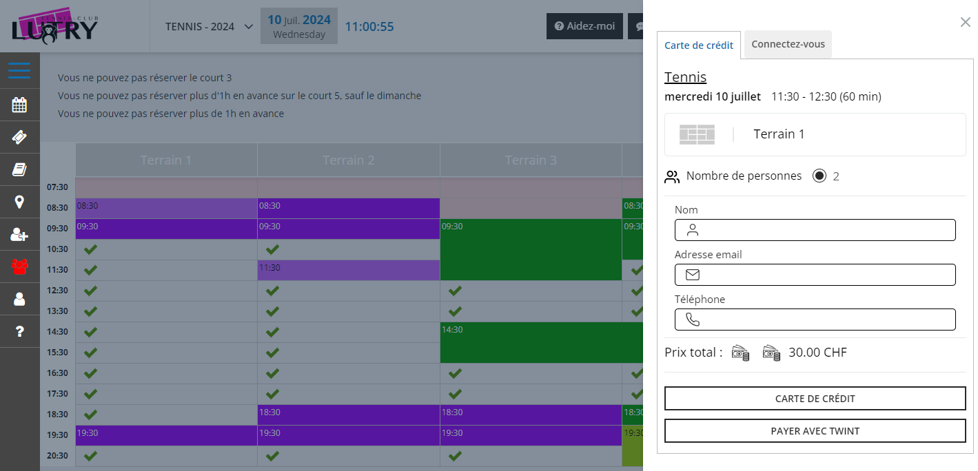 Exemple concret d’une réservation pour des gens qui ne sont pas membres: il est 11h00 et vous souhaitez réserver pour 11h30: